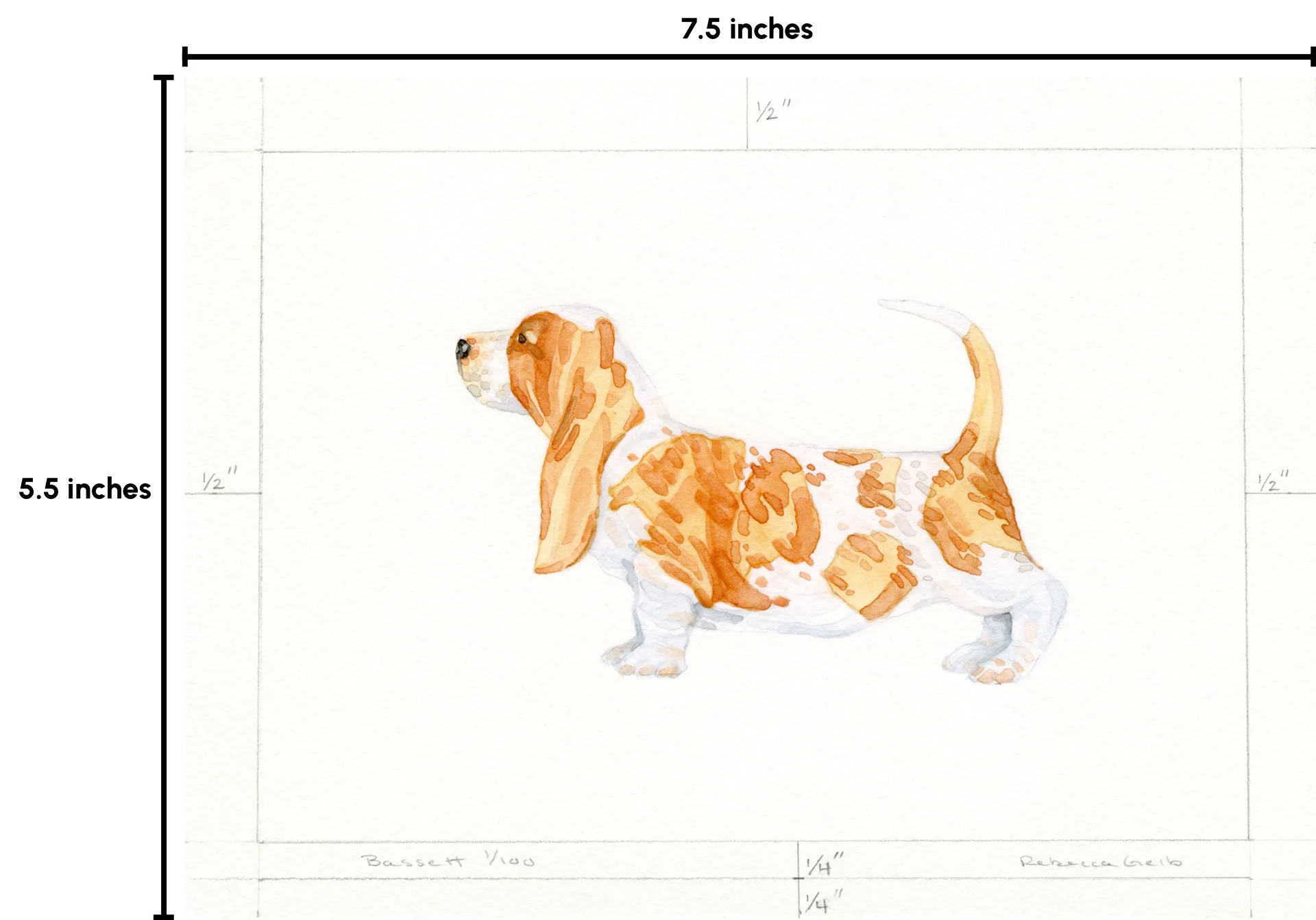 All prints are high-quality giclée reproductions printed on archival fine art paper. Each of my artworks includes a matting border, are hand-signed, numbered, and part of a limited edition series. Below is an image of a 7.5 inch x 5.5 inch sample for reference. Pencil measurement lines in the illustration below will not appear on the actual artwork, they are solely for reference. Matting borders are included in the total dimension of the piece.